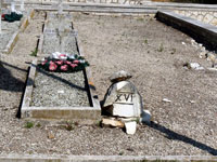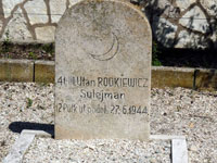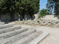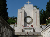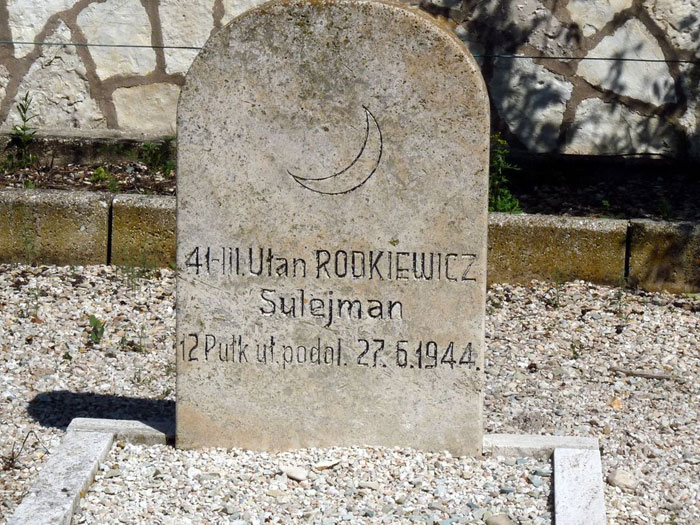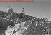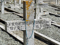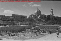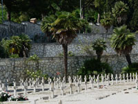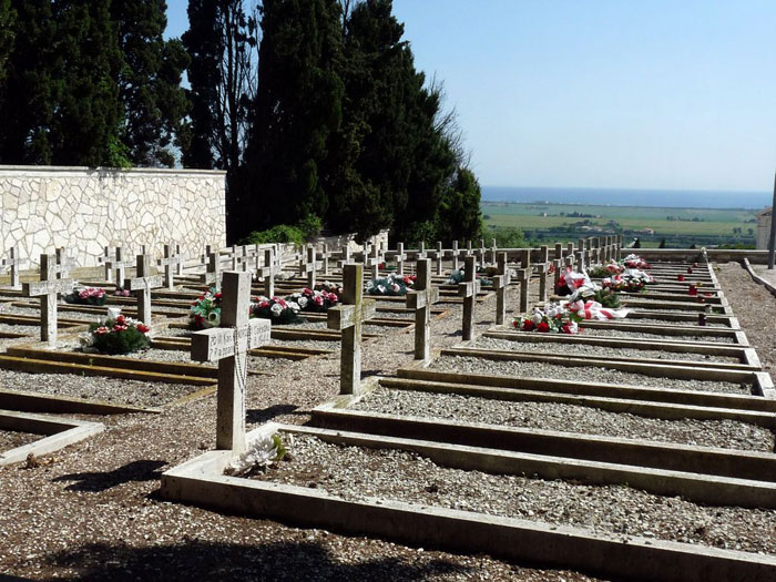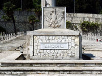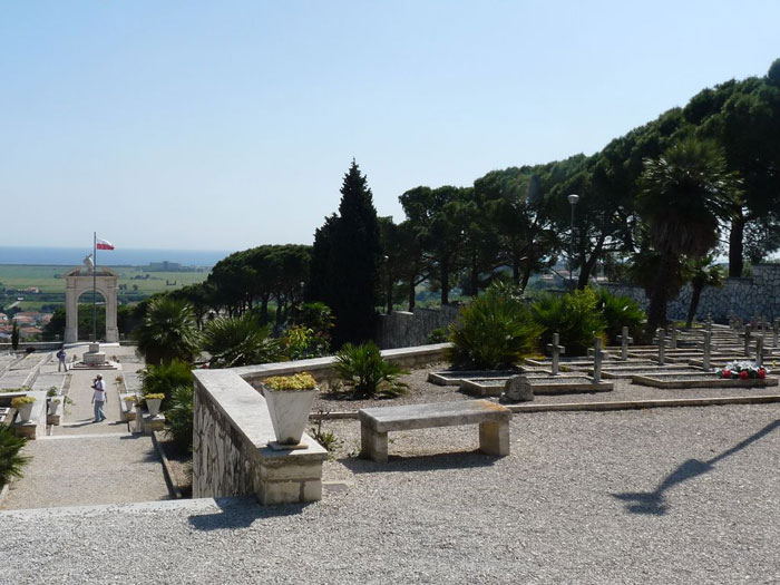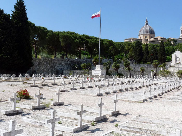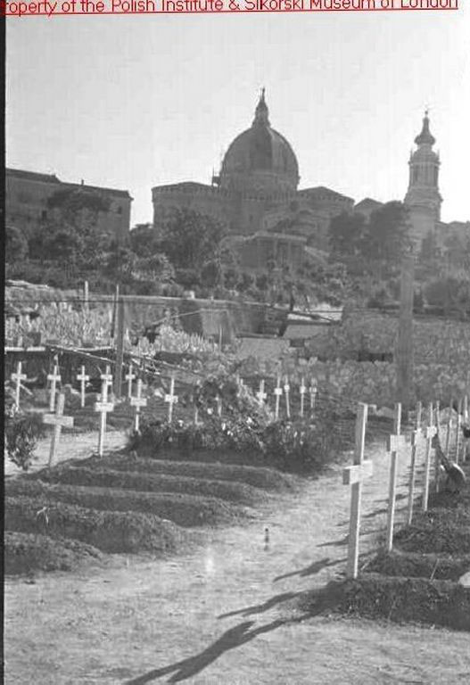 Jan Bielatowicz "LAUR KAPITOLU I WIANEK RUTY" wyd.VERITAS "Cmentarz w Loreto, otoczony wysokim murem, składa się z trzech mniejszych tarasów górnych i z obszernego dolnego. Zagrożony jest przede wszystkim ten dolny; groby na nim wraz z całym terenem pochyliły się ku morzu. Na środku stoi maszt na kamiennym cokole z orłem polskim i z napisami po czterech stronach: LORETO ANKONA METAURO - LINIA GOTÓW. Spoczywają tu żołnierze polegli w walkach na tym szlaku. Na bramie wejściowej umieszczona jest figura Zbawiciela.Wiodą do niej od strony morza kamienne schody, obecnie zamknięte dla przejścia. Na najwyższym tarasie sto wysoki ołtarz kamienny z płaskorzeźbą Matki Boskiej Ostrobramskiej w marmurze. U spodu umieszczono płaskorzeźby znaków korpusnych i krzyża Virtuti Militari. Trzy górne tarasy zamknięte są obmurowanymi profilami. Nad grobami chylą się cyprysy i bujne kiedyś wierzby płaczące. W szpalerach i przy murach plenią się rozłożyste krzewy oleandrów. Groby ujęte są w formy z kamienia i zaopatrzone w krzyże. Wapień z pobliskiej góry Conero źle znosi zmiany pogody, dlatego zrobione zeń krzyże i formy pękają i łuszczą się, tak że na niektórych grobach pozostała już tylko darń i garść łupku. Wśród tysiąca osiemdziesięciu poległych spoczywa 11 żołnierzy Żydów, pogrzebanych obok siebie, jedyny mahometanin ułan Sulejman Rodkiewicz z pułku ułanów podolskich, osobny rząd zajmuja ewagelicy i prawosławni. Mają też swój kąt żołnierze nieznani." |