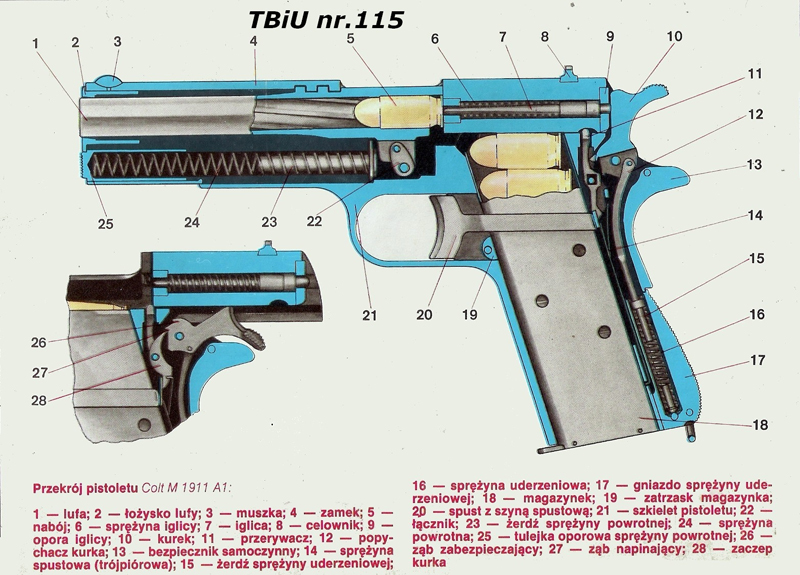 Etatową broń boczną żołnierzy II Korpusu stanowiły pistolety Colt M1911A1, oraz rewolwery Enfield No. 2 Mk.1 . ,Smith & Wesson lub Webley&Scott. PISTOLET COLT M1911 A1 Amerykański pistolet samopowtarzalny konstrukcji Johna M. Browninga, działający na zasadzie krótkiego odrzutu lufy. Ryglowanie przez przekoszenie w płaszczyźnie pionowej, wymuszone przez ruchomy łącznik spinający tylną część lufy za szkieletem broni. Luźna współpraca poszczególnych mechanizmów zapewniała dużą niezawodność działania oraz odporność na zanieczyszczenia w warunkach bojowych. Zasilanie z magazynka pudełkowego o pojemności 7 naboi. Przyrządy celownicze stałe,wyskalowane na 50m. Zastosowanie 3 niezależnych bezpieczników zapewniało wysokie bezpieczeństwo użytkowania. Duża energia naboju zapewniała celność, oraz znaczą siłę rażenia pocisku. Dane taktyczno -techniczne: Kaliber: 11,43mm ( 0,45 cala ) Animacja prezentująca działanie pistoletu: