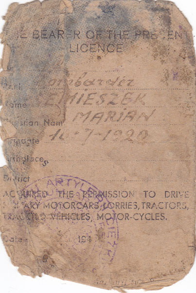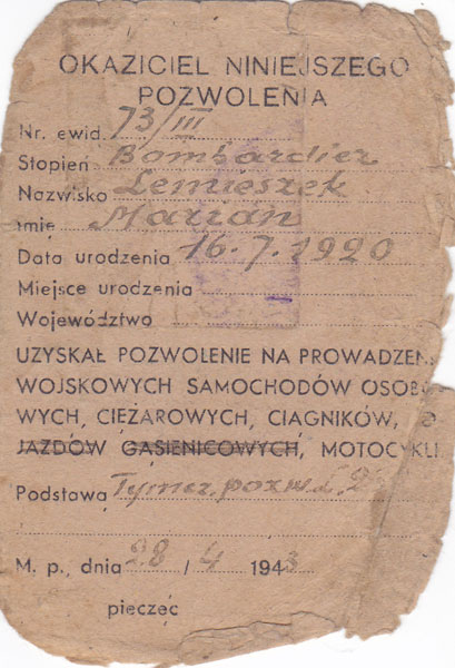 Podczas kampanii włoskiej poza obowiązkami wynikającymi ze stanowiska służył też jako kierowca dowódcy. Czego dokumentem jest tymczasowo wydane prawo jazdy: