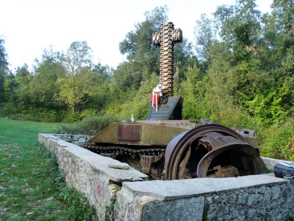 Pomnik powstał u wylotu Gardzieli w kierunku Albanetty, gdzie 12 maja 1944 r. czołg Sherman pod dowództwem p.por. Ludomira Białeckiego, wyleciał na zwielokrotnionej minie. Potężna siła wybuchu spowodowała detonację amunicji w czołgu, oderwanie i odrzucenie wieżyczki. Obecny układ pomnika jest taki sam jaki pozostał po bitwie. Czołg został tylko podmurowany i otoczony murkiem.