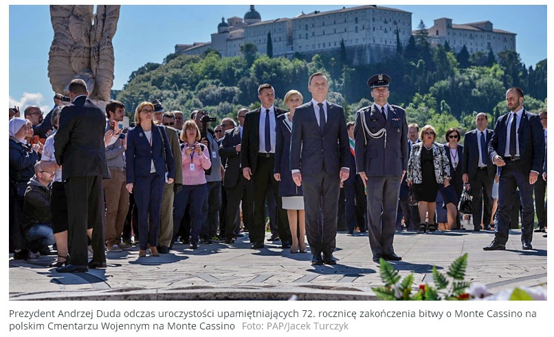 Uroczyste obchody 72 rocznicy zakończenia bitwy pod Monte Cassino W godzinach popołudniowych odbył się uroczysty capstrzyk z udziałem weteranów przy pomniku 3 Dywizji Strzelców Karpackich na wzgórzu 593. 18 maja odbyła się uroczystość na Polskim Cmentarzu Wojennym na Monte Cassino, z udziałem pary prezydenckiej, weteranów, przedstawicieli władz polskich i włoskich. W homilii wygłoszonej podczas odprawionej mszy świętej, Biskup Józef Guzdek mówił m.in. o znaczeniu zakończonej 72 lata temu bitwy, zarówno dla sytuacji polityczno - militarnej w Europie, jak również osobistej " To jest nasz wielki dorobek i to jest nasze prawo mówić o tym z dumą. Uroczystość zakończyła się apelem pamięci i złożeniem kwiatów.