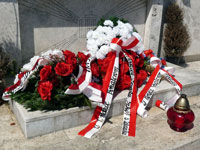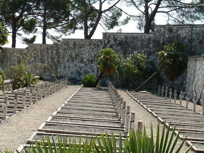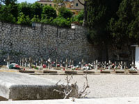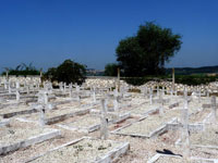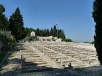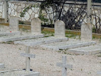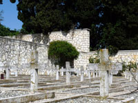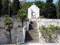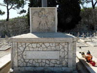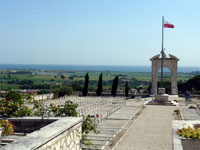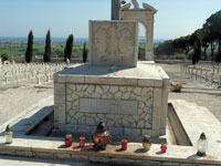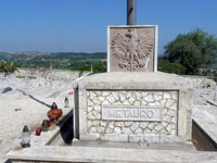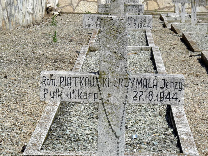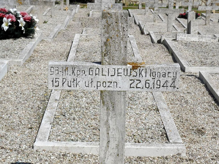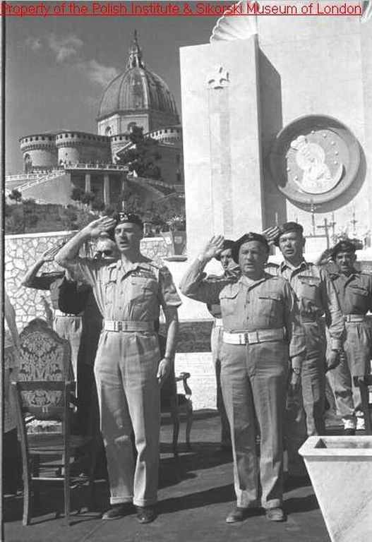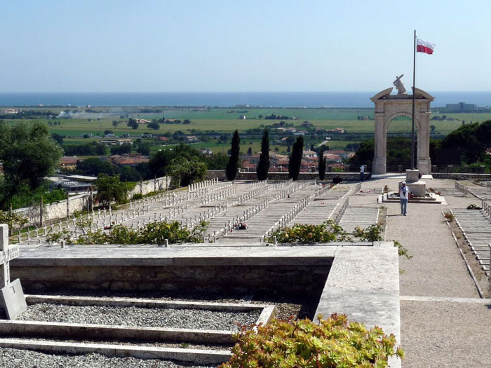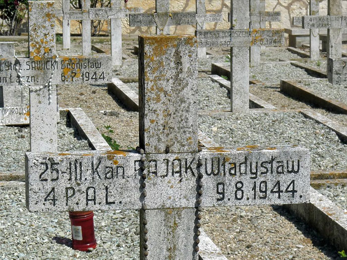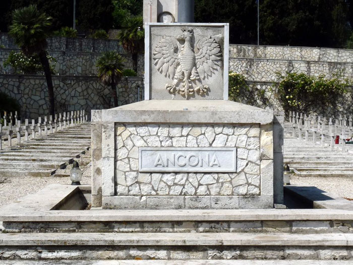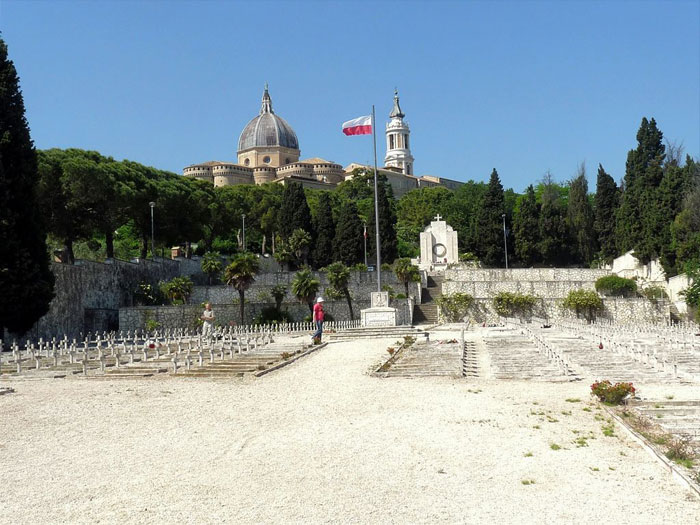 Jan Bielatowicz "LAUR KAPITOLU I WIANEK RUTY" wyd.VERITAS "Cmentarz w Loreto, otoczony wysokim murem, składa się z trzech mniejszych tarasów górnych i z obszernego dolnego. Zagrożony jest przede wszystkim ten dolny; groby na nim wraz z całym terenem pochyliły się ku morzu. Na środku stoi maszt na kamiennym cokole z orłem polskim i z napisami po czterech stronach: LORETO ANKONA METAURO - LINIA GOTÓW. Spoczywają tu żołnierze polegli w walkach na tym szlaku. Na bramie wejściowej umieszczona jest figura Zbawiciela.Wiodą do niej od strony morza kamienne schody, obecnie zamknięte dla przejścia. Na najwyższym tarasie sto wysoki ołtarz kamienny z płaskorzeźbą Matki Boskiej Ostrobramskiej w marmurze. U spodu umieszczono płaskorzeźby znaków korpusnych i krzyża Virtuti Militari. Trzy górne tarasy zamknięte są obmurowanymi profilami. Nad grobami chylą się cyprysy i bujne kiedyś wierzby płaczące. W szpalerach i przy murach plenią się rozłożyste krzewy oleandrów. Groby ujęte są w formy z kamienia i zaopatrzone w krzyże. Wapień z pobliskiej góry Conero źle znosi zmiany pogody, dlatego zrobione zeń krzyże i formy pękają i łuszczą się, tak że na niektórych grobach pozostała już tylko darń i garść łupku. Wśród tysiąca osiemdziesięciu poległych spoczywa 11 żołnierzy Żydów, pogrzebanych obok siebie, jedyny mahometanin ułan Sulejman Rodkiewicz z pułku ułanów podolskich, osobny rząd zajmuja ewagelicy i prawosławni. Mają też swój kąt żołnierze nieznani." |