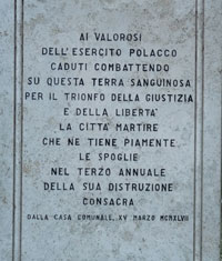 Jan Bielatowicz "LAUR KAPITOLU I WIANEK RUTY" wyd.VERITAS - Londyn "Już dwa dni po bitwie o Monte Cassino szef duszpasterstwa Drugiego Korpusu, ks.Włodzimierz Cieński i kilku oficerów sztabu przybyło na pole bitwy, aby wybrać miejsce na cmentarz dla poległych. Ostatecznie zgodzono się na wybór głównego projektodawcy i budowniczego cmentarza inż. Wacława Jerzego Hryniewicza. Ziemia na cmentarz w dziewięciu dziesiątych była własnością klasztoru, a reszta należała do właścicieli prywatnych. Drobni właściciele otrzymali odszkodowanie w gotówce, natomiast Opactwo oddało ziemie Polakom w wieczystą dzierżawę, na podstawie aktu cesji, podpisanego dnia 29 lipca w bazylice św. Pawła za Murami w Rzymie. Ze strony polskiej akt ten podpisali: gen. Władysław Anders, kap. Tadeusz Zandfos (projektodawca i budowniczy pomnika Karpatczyków na wzgórzu 593), sierż. Franciszek Pest i strz. Józef Gąsior, ze strony benedyktyńskiej : opat Matteo Renato Ildefonso Rea di Nazareno, Don Domenico Tommaso Leccisotti, historyk opactwa , Don Nicola Clemente i Don Martino Matronola. Obszar odstąpiony na cmentarz mierzy blisko pięć hektarów. Budowa cmentarza trwała dwa lata, od października roku 1944 do października roku 1946. Projekty wykonał architekt Wacław J. Hryniewicz oraz architekt Jerzy Skolimowski, kierownikiem robót był inż. Tadeusz Muszyński. Prace rzeźbiarskie wykonał art. Michał Paszyn oraz Włoch prof. Ciambelotti. Prace wykonywało dziennie: 39 żołnierzy polskich z 304 plutonu mechanicznego, około 40 kierowców oraz od 400 do 700 robotników włoskich. W czasie prac 11 Włochów zginęło od wybuchów min i pocisków. Koszta robocizny, wyżywienie robotników i transport opłacił rząd brytyjski. Kamień na roboty szedł z pobliskich kamieniołomów, trawertyn na nagrobki i płyty ofiarował częściowo rząd włoski z "wystawy narodowej" przy Via Ostia w Rzymie, zamierzonej jeszcze przed wojną, ale nie doszłej do skutku, częściowo zaś płyty zakupiono, za sumę blisko trzech tysięcy lirów. Na cmentarzu spoczęły szczątki poległych w dotychczasowych walkach, po ekshumacji ciał z prowizorycznych cmentarzy i pojedynczych grobów. Spoczęli tu również niektórzy zmarli później z ran odniesionych w bitwie o Monte Cassino. W samej bitwie padło 924 żołnierzy Polskiego Korpusu. Cmentarz poświęcił Biskup Polowy Wosk Polskich, Józef Gawlina w dniu 1 września 1945 roku. Cmentarz polski, jak dywan z kamienia, rozścielony jest u stoków wzgórz 593 i 569, w dolince podklasztornej. Sciegi jego osnute są z bieli i zieleni. Na grobowisko rzucono krzyż z wiecznej zieleni, którego korpus stanowi orzeł biały na płycie z trawertynu. Z daleka wygląda on prawie jak odznaka na czapce żołnierskiej. W rzeczywistości jest to zespół bloków o powierzchni dziesięć na siedem metrów. Otacza je szpaler tuj srebrzystych. Groby pokryte płytami z nazwiskami poległych, z ciężkimi krzyżami z trawertynu, wyrównane są na sposób wojskowy w dwuszeregach na dziesięciu tarasach. Napisy na grobach składają się z 68 tysięcy liter, rytych i napuszczanych barwą "rosso pompeiano". Na grobach prawosławnych stoją krzyże greckie, na żydowskich owalne nagrobki z gwiazdą syjońską, na jednym tatarskim płyta z imieniem Allacha. W prawym kącie u góry trzy groby z ciałami dziewięciu nieznanych żołnierzy. Prawosławni i żydzi leżą w swoich grupach. Razem i ci nieznani, jakby jakieś osobne wyznanie."